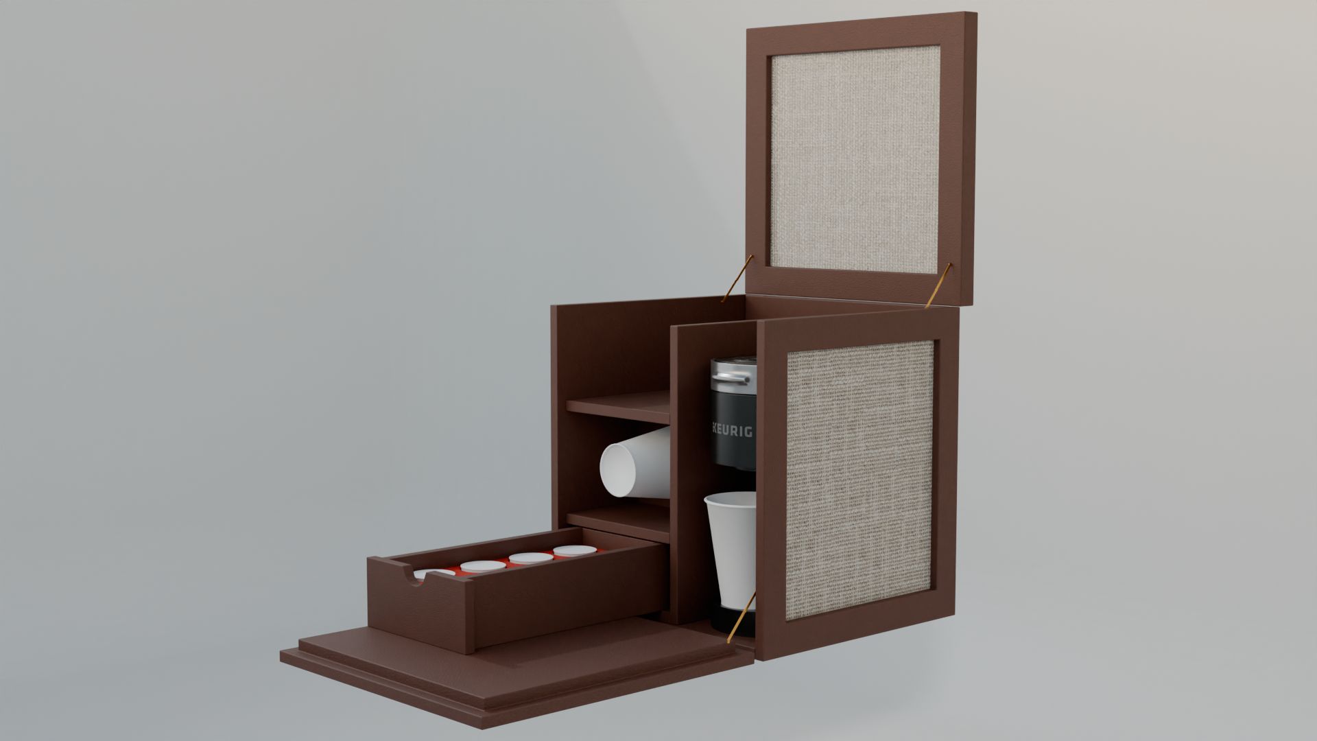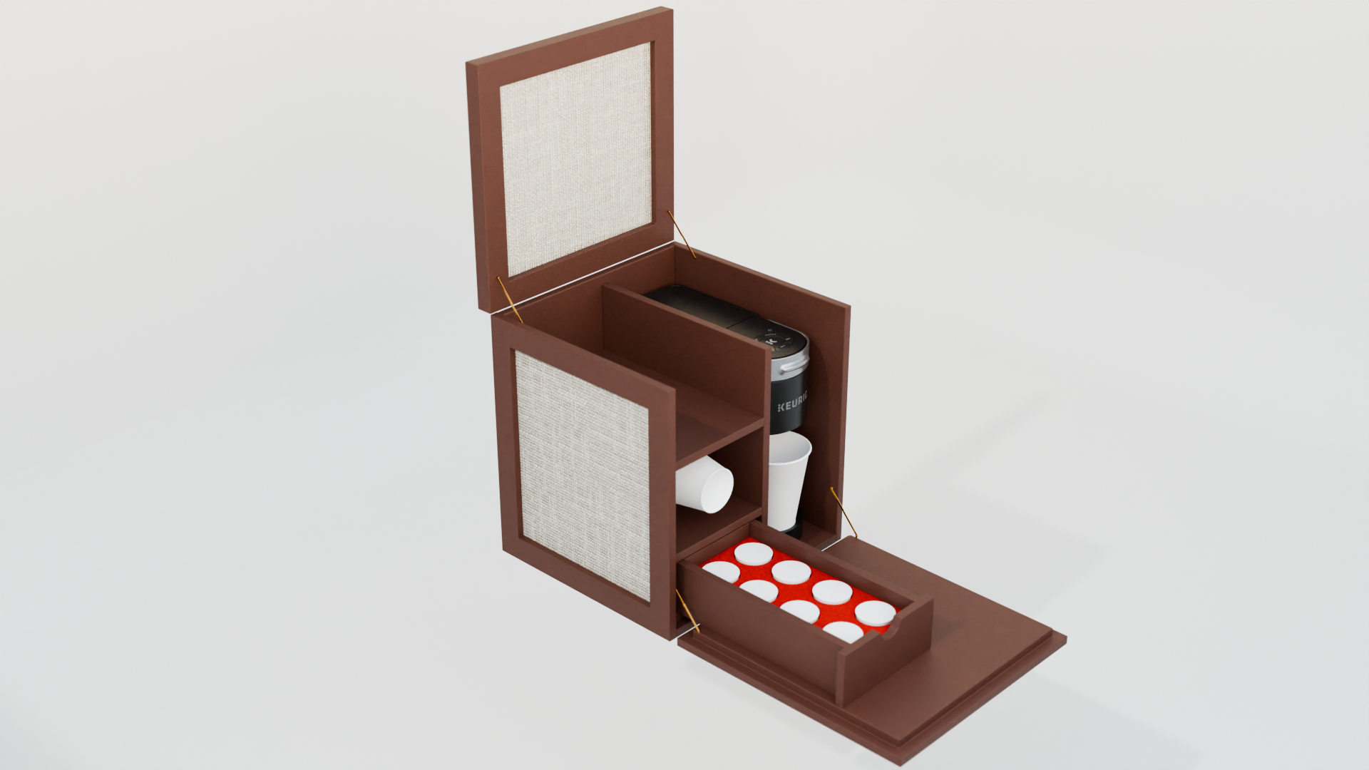 Designed, 3D modeled, and animated Coffee Box made to fit Keurig K-Mini Coffee machine, K-Cup pods, and disposable cups